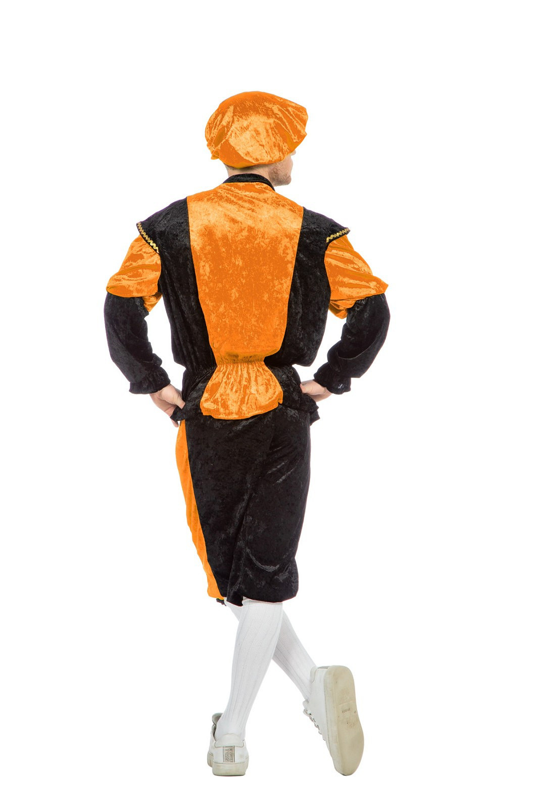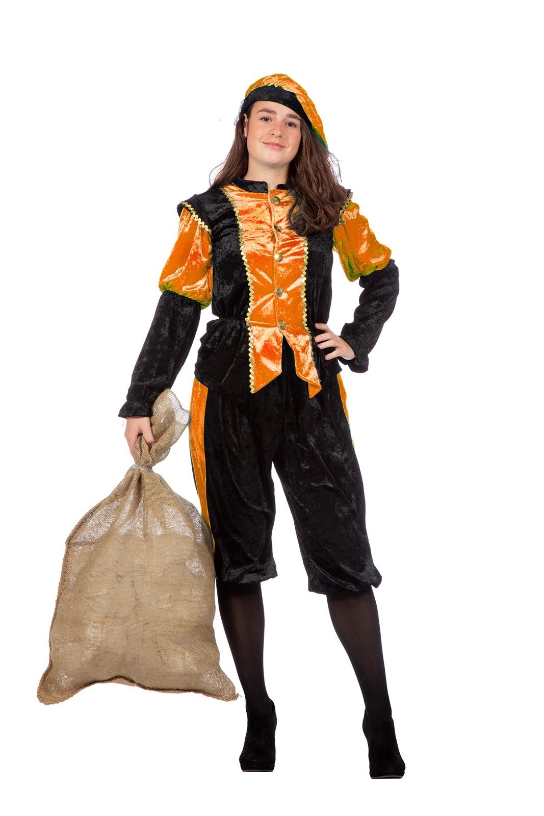 Pieten kostuum zwart/oranje bestaande uit: Broek, Shirt en Baret