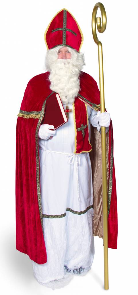 Compleet luxe sinterklaas set bestaande uit: mijter, staf (3-delig, van plastic), baard plus pruik, witte albe, onderkleed, rode mantel, witte handschoen, ring met robijn, ketting met kruis en als laatste het boek van sinterklaas (dient ter decoratie, bladzijdes toevoegen of boek openslaan is niet mogelijk).
