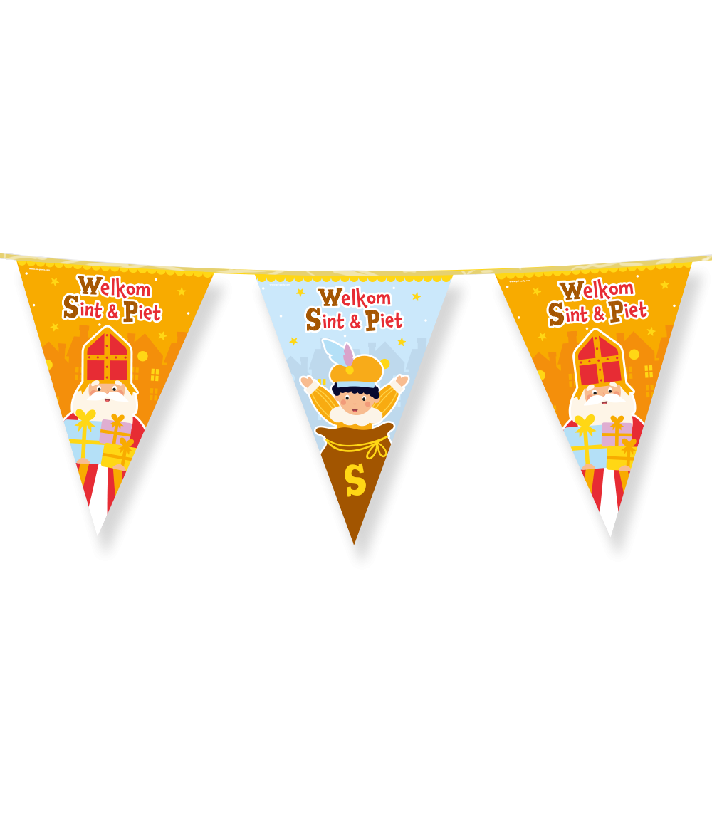 Versier jouw huis, klaslokaal of winkel met de feestelijke Vlaggenlijn Welkom Sint & Piet van Feestbazaar! Deze kleurrijke vlaggenlijn, met vrolijke cartoonafbeeldingen van Sint en Piet, creëert direct de juiste sfeer voor het Sinterklaasfeest en maakt elke ruimte klaar voor de intocht of pakjesavond.